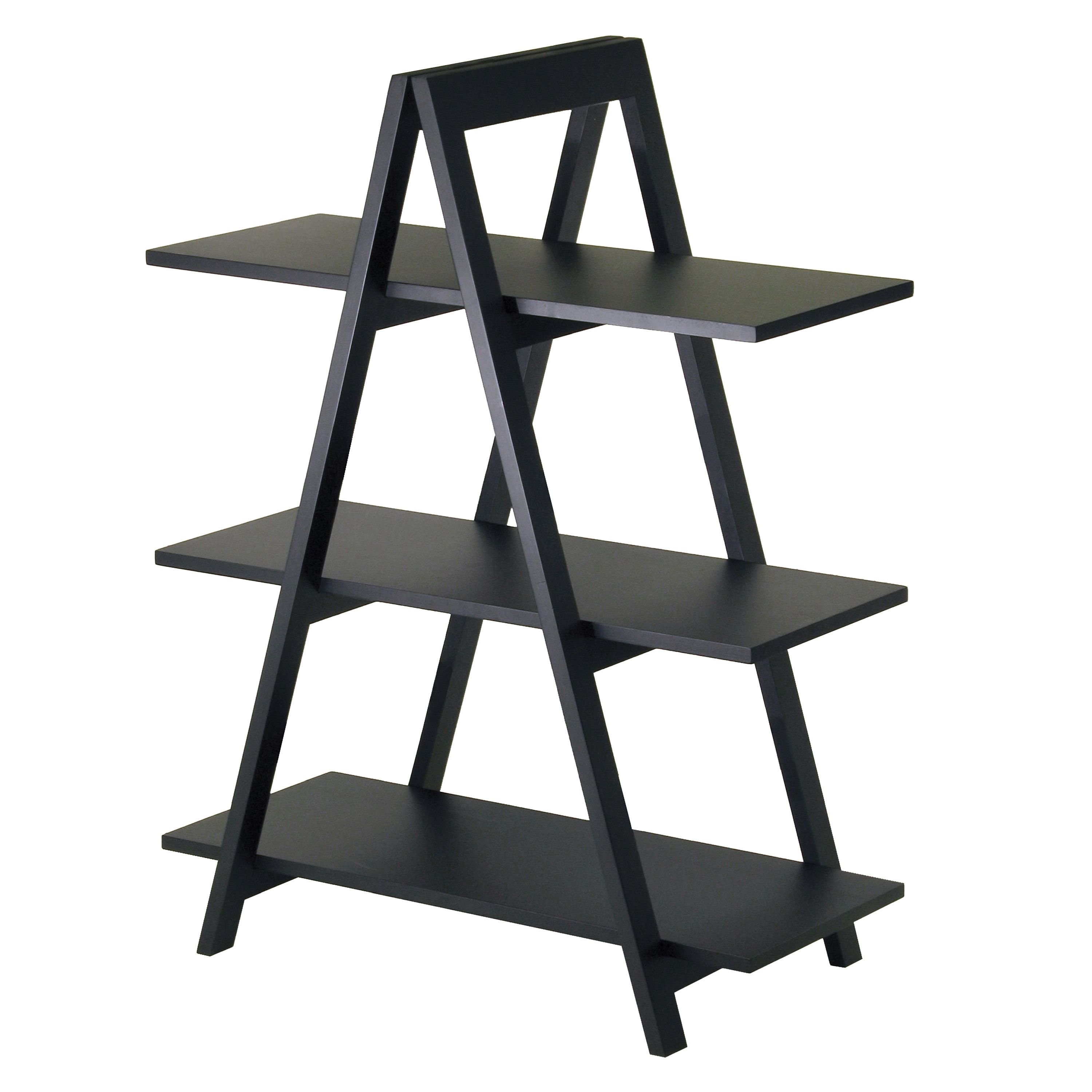 The Aaron A-Frame Shelf features an exciting; modern design; these shelves are ideal for storing and displaying books and more. The shelf will provide your home with a great practical accent piece. Shelf dimension is 30.1"W x 12.1"D. Distance between shelves is 11.9". Static load is 50lbs per shelf. Made of solid wood frame and MDF shelves; black finish. Assembly required.Shelf assembled size is 30.1"W x 15.2"D x 38.3"H3-Tier Shelf; distance between each shelf is 11.9". Shelf surface is 30.1"W x 12.1"DSold wood frame; MDF shelves; black color. Assembly required.nullnullnull